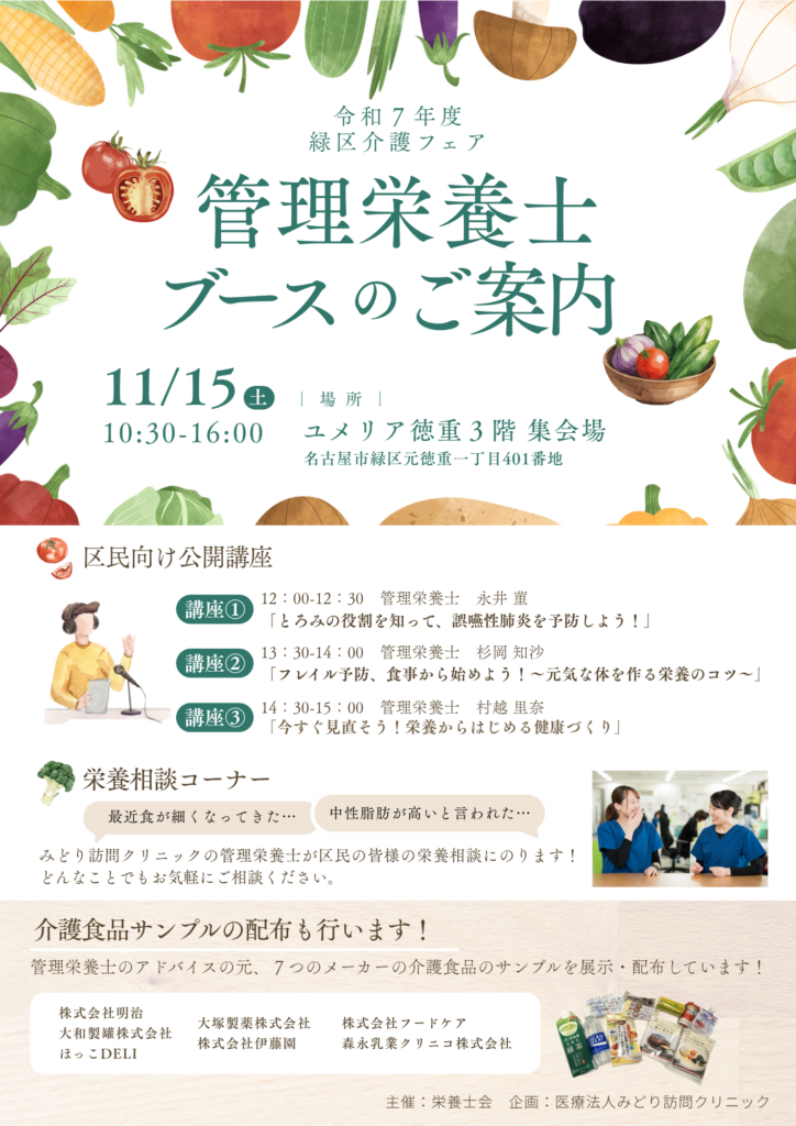既報の通り、2025年11月15日土曜日に名古屋市緑区にあるユメリア徳重で開催される「緑区介護フェア」において、医師会ブースを当院が担当することに加えて、栄養士会ブースも同室で展開させて頂くことになりました(詳細は添付ファイルご参照)。当日は、様々な催しをご用意しておりますので、奮ってご参加下さい。